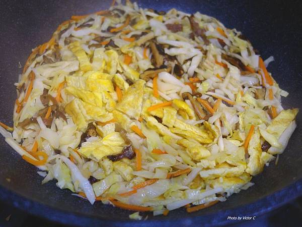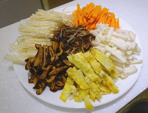 再依序加入紅蘿蔔、竹筍、木耳、金針菇和煎蛋,