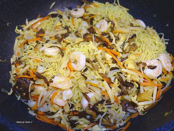 最後把蝦仁和拉麵一起加入已經悶軟入味的炒麵食材中拌炒,