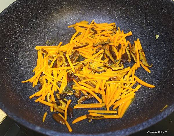 做法是先把所有食材切絲,先熱鍋用油煸香香菇,